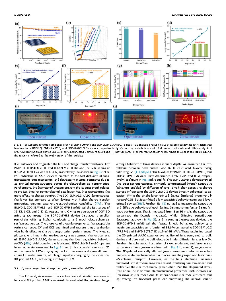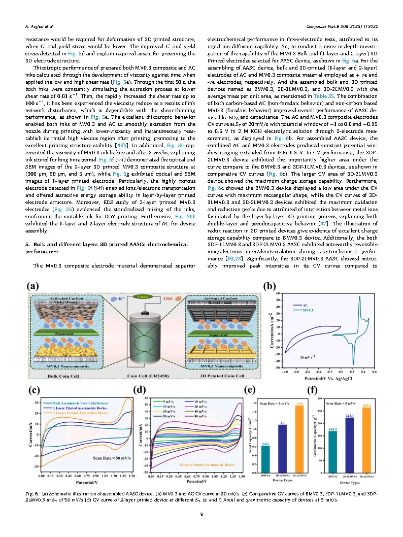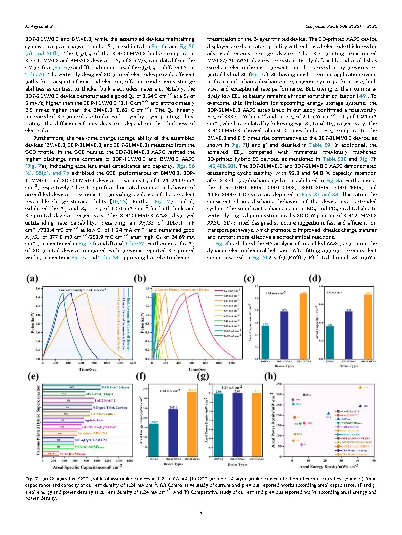 结果显示,3DP-2LMV0.3 器件在 6.2 mg/cm2 质量负载下面容量达 1.54 C/cm2,1.24 mA/cm2 电流密度下面能量密度 333.4 μWh/cm2(高于 3DP-1LMV0.3 与块状器件),面功率密度 2.1 mW/cm2,5000 次充放电后容量保持率 94.8%。该研究证实 DIW墨水直写3D 打印机打印构建垂直多孔厚电极的潜力,为先进储能器件提供方案。