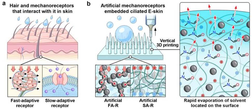 概念图1:表皮毛发和微纤毛阵列示意图。(a)表皮毛发及其与真皮中多个机械感受器(如快适应感受器和慢适应感受器)相互作用的示意图。(b)基于嵌入炭黑(CB)和离子液体(IL)的聚氨酯(PU)基质的防水纤毛电子皮肤(WCES)的设计原理。在压力作用下,炭黑的颗?;屠胱右禾逯械睦胱忧ㄒ品直鹉D饪焓视Ω惺芷骱吐视Ω惺芷鞯姆从ΑJ褂没臃⑿匀芗两郯滨ジ春喜牧吓渲瞥筛咔αδ?,通过基于挤出的直接墨水书写技术实现微纤毛的垂直3D打印,在此过程中,溶剂的快速蒸发会在表面产生稳定性。