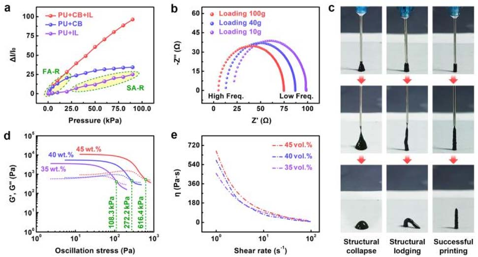 图1:不同材料制成的薄膜的特性以及微纤毛的打印工艺。(a) 不同材料制成的薄膜在压力下的电响应。(b) 由PU、CB和IL制成的薄膜在不同加载条件下的阻抗奈奎斯特图。(c) 不同油墨垂直3D打印微纤毛过程中关键时刻的照片。从左到右,油墨的CB含量分别为35 wt%、40 wt%和45 wt%。(d) 三种油墨样品的流变特性。实线和虚线分别代表储能模量(G')和损耗模量(G'')。(e) 油墨样品的表观粘度(h)与剪切速率的函数关系.