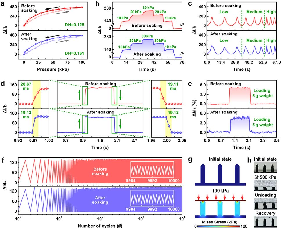 图 3 水合碳电极传感器(WCES)浸泡前后其他传感性能的变化,包括动态范围(DH)(a)、重现性(b 和 c)、响应时间(RT)(d)和检测限(LoD)(e)。(f)水合碳电极传感器(WCES)浸泡前后经过 10000 次循环的稳定性测试结果。(g)通过有限元分析得到的 100 千帕压力下微纤毛的应力分布。(h)显示压力加载 - 卸载过程中微纤毛过载情况的照片。