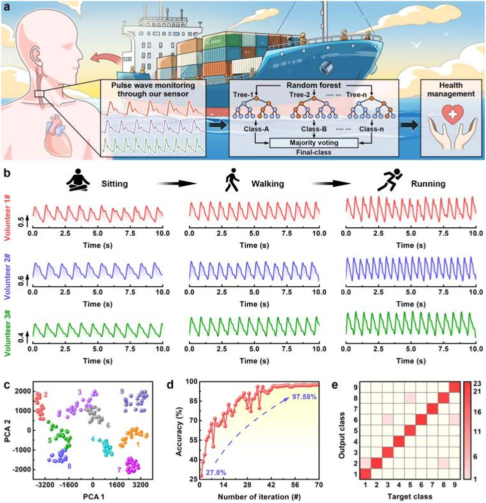 基于 AutoBio1000 制备的 WCES,团队进一步构建了船员健康管理系统:在 80% 相对湿度环境中,将 WCES 贴附于颈动脉处,可清晰捕捉脉搏信号(含 3 个特征峰),并结合随机森林(RF)机器学习模型对不同生理状态(静坐、行走、慢跑)下的脉搏信号进行分类,识别准确率高达 97.58%。