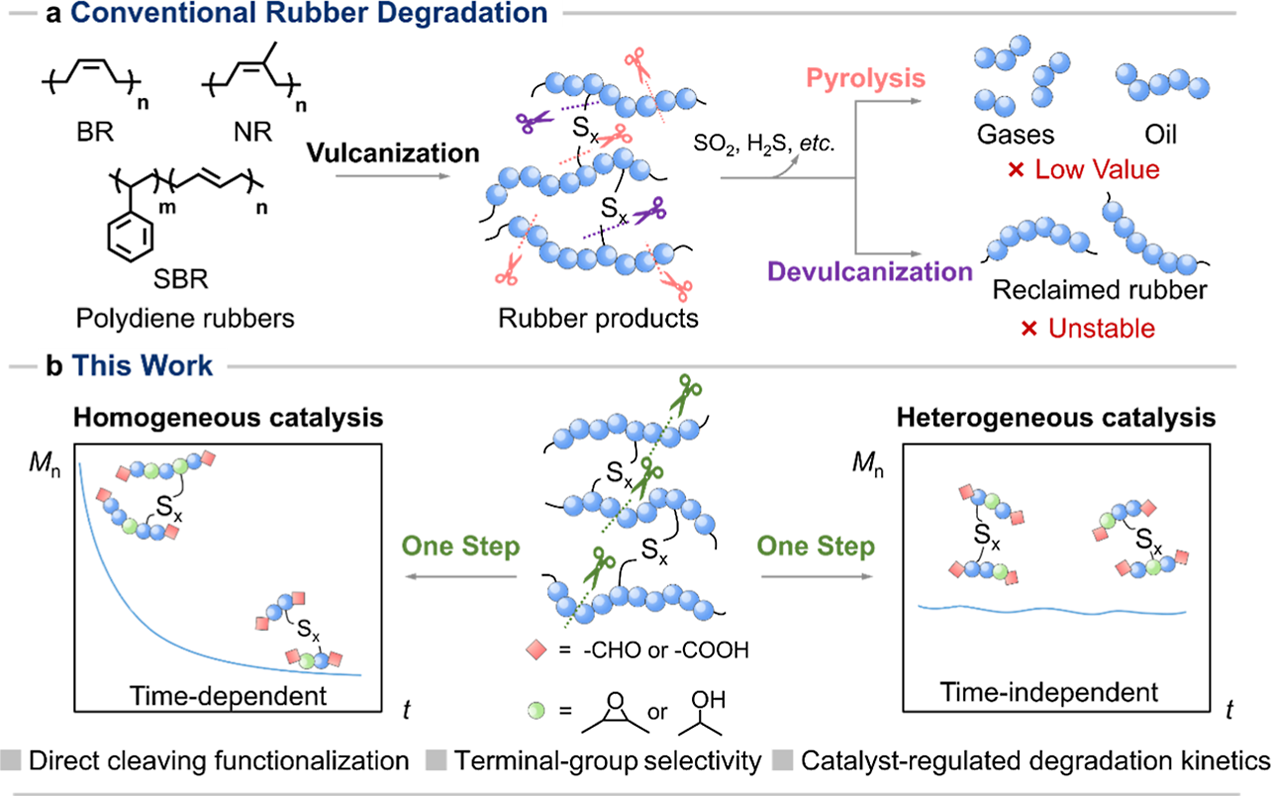 团队研发出一种温和的一步氧化法,基于 N - 羟基邻苯二甲酰亚胺(NHPI)的相调控催化体系,实现硫化橡胶主链 C=C 键的选择性裂解,对比传统热解、脱硫等回收手段,该方法从根本上解决了硫化橡胶难降解、回收产物价值低的痛点,可制备出醛基 / 羧基封端的功能化橡胶片段,产物回收率超 95%,且全程无有毒气体排放、反应条件温和(80℃、常压氧气)。