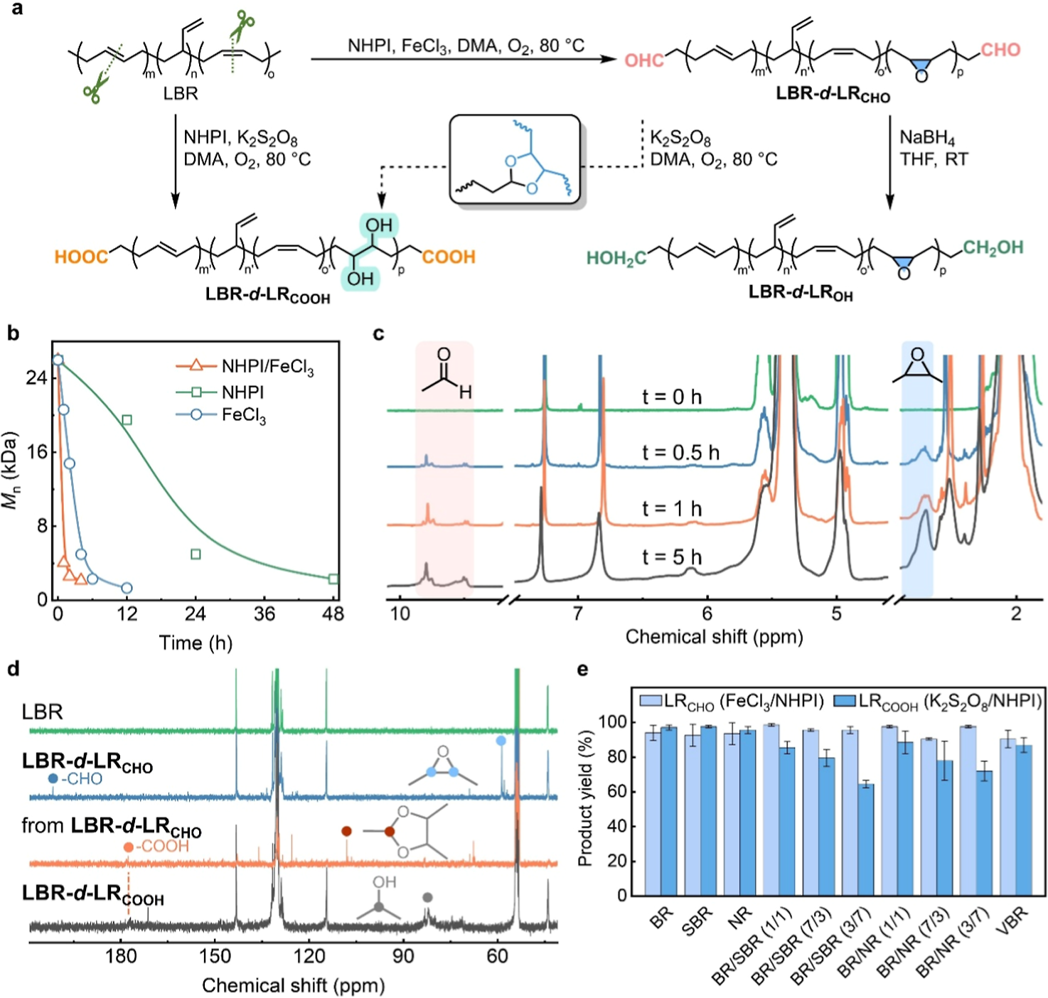 One-step backbone cleavage of rubber by homogeneous catalysis. (a) Oxidative cleavage of polydiene main-chain of LBR affords aldehyde- and carboxyl-terminated fragments. (b) GPC traces showing time-dependent molar-mass decline of LBR-d-LRCHO under various catalytic conditions. (c) Stacked 1H NMR spectra confirming the incorporation of aldehyde and epoxy groups at 0.5, 1, and 5 h. (d) Stacked inverse-gated-decoupling 13C NMR spectra of LBR, LBR-d-LRCHO, oxidation product from LBR-d-LRCHO and LBR-d-LRCOOH to confirm acetal, polyol and carboxyl groups. (e) Recovery yields of aldehyde-terminated liquid rubbers obtained via FeCl?/NHPI-catalyzed degradation and carboxyl-terminated liquid rubbers obtained via K?S?O?/NHPI-catalyzed degradation from NR, SBR, BR, their blends, and VBR.