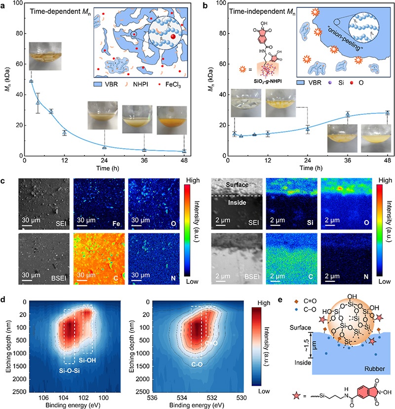Phase-regulated control over degradation kinetics of vulcanized rubber. (a) Homogeneous catalysis yields progressively smaller fragments, mimicking reversed step-growth. (b) Heterogeneous catalysis confines cleavage to surfaces, producing nearly constant molar-mass products, similar to the “onion-peeling” process. (c) EPMA images of brittle fracture surfaces under homogeneous (left) and heterogeneous (right) conditions, showing distinct reaction pathways. (d) XPS depth profiling combined with ion beam etching during midstage heterogeneous catalysis reveals surface-localized oxidation. (e) Schematic of heterogeneous degradation, integrating EPMA/XPS evidence for surface-confined cleavage.