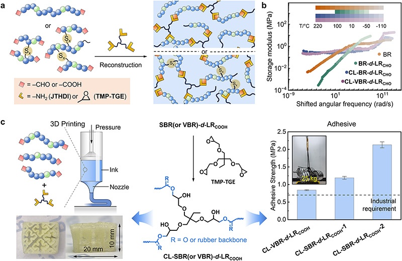 Reconstruction of degradation products into high-value functional materials. (a) Reconstruction of end-functionalized liquid rubber fragments into polymer networks. (b) Rheological master curves of the BR, BR-d-LRCHO, CL-BR-d-LRCHO and CL-VBR-d-LRCHO. (c) Applications based on the reconstruction of functionalized fragments. Left: 3D printing by precross-linked CL-SBR-d-LRCOOH ink. Right: Wood adhesives based on the reconstructed CL-VBR-d-LRCOOH and CL-SBR-d-LRCOOH.
