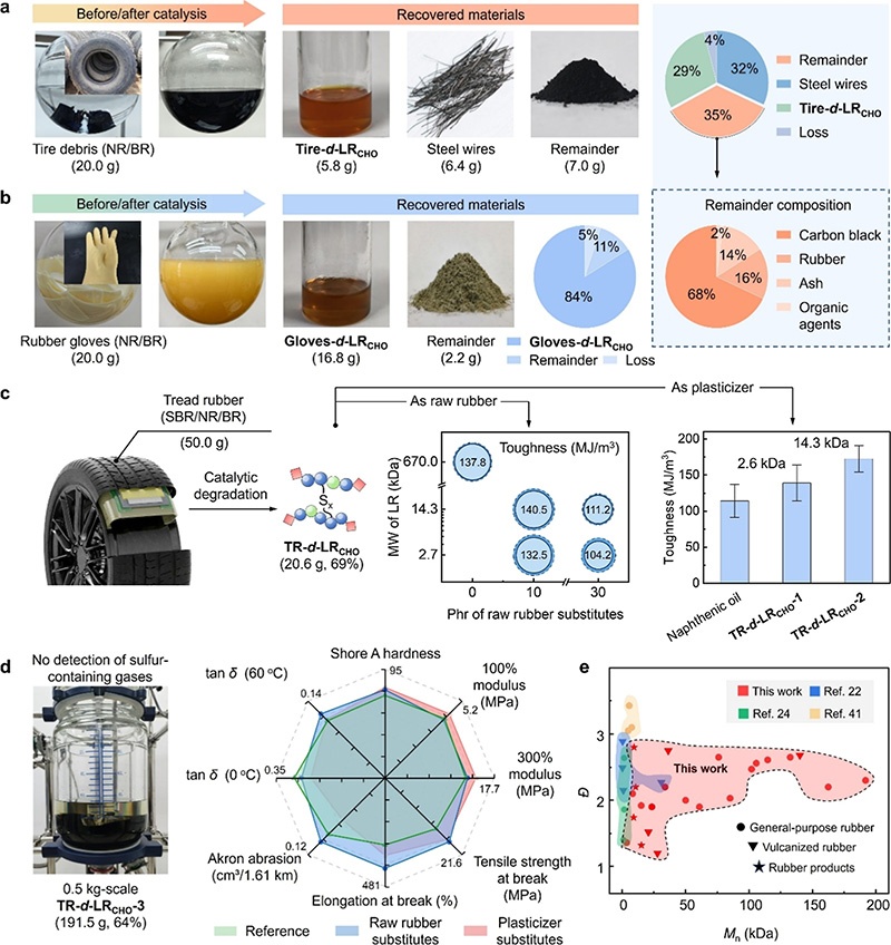 Scalable deconstruction of rubber products. (a,b) Waste tires and gloves, converted into functionalized liquid fragments, with simultaneous recovery of inorganic residues. (c) TR-d-LRCHO obtained from tread rubber was directly applied as a replacement for raw rubbers or plasticizers in tire tread formulations. (d) Left: pilot-scale (0.5 kg) degradation validates robustness and scalability. Right: performance comparison of industrial formulations with and without TR-d-LRCHO confirms industrial relevance. (e) Molar masses and polydispersity indices of fragments obtained from different rubbers via distinct deconstruction routes.